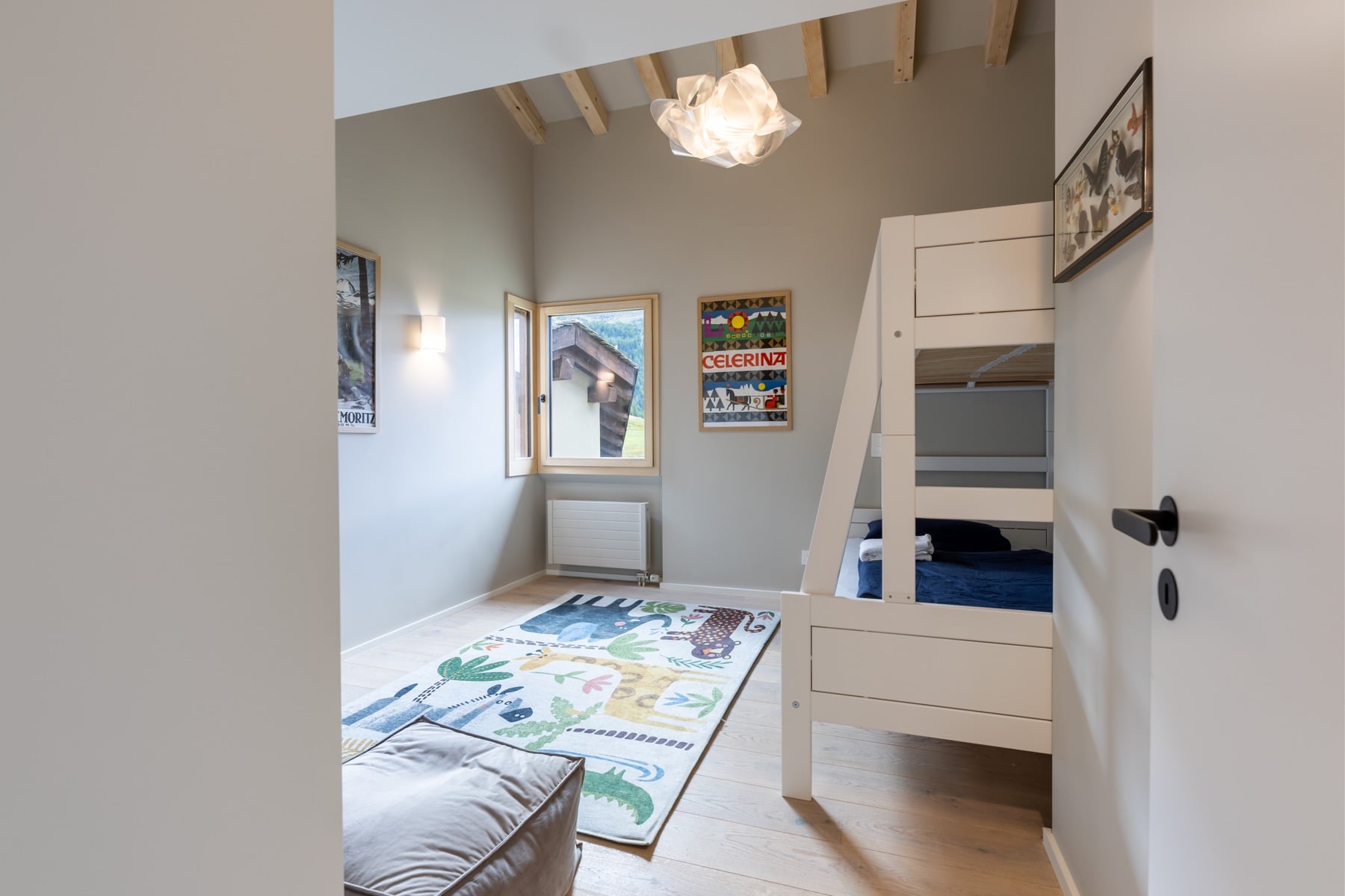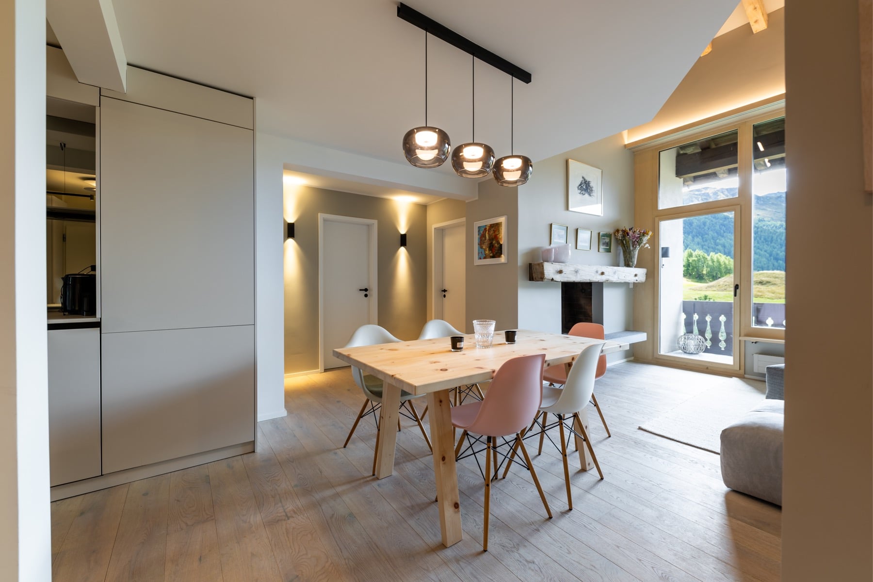 Nur wenige Gehminuten vom Skigebiet Corvatsch entfernt bietet diese stilvolle und elegante, komplett renovierte Wohnung im zweiten Stock eines Gebäudes namens Crest'alta Platz für bis zu sechs Personen auf zwei Etagen in zwei geräumigen Doppelzimmern und einem Einzelzimmer mit einem Etagenbett, ideal für Kinder.