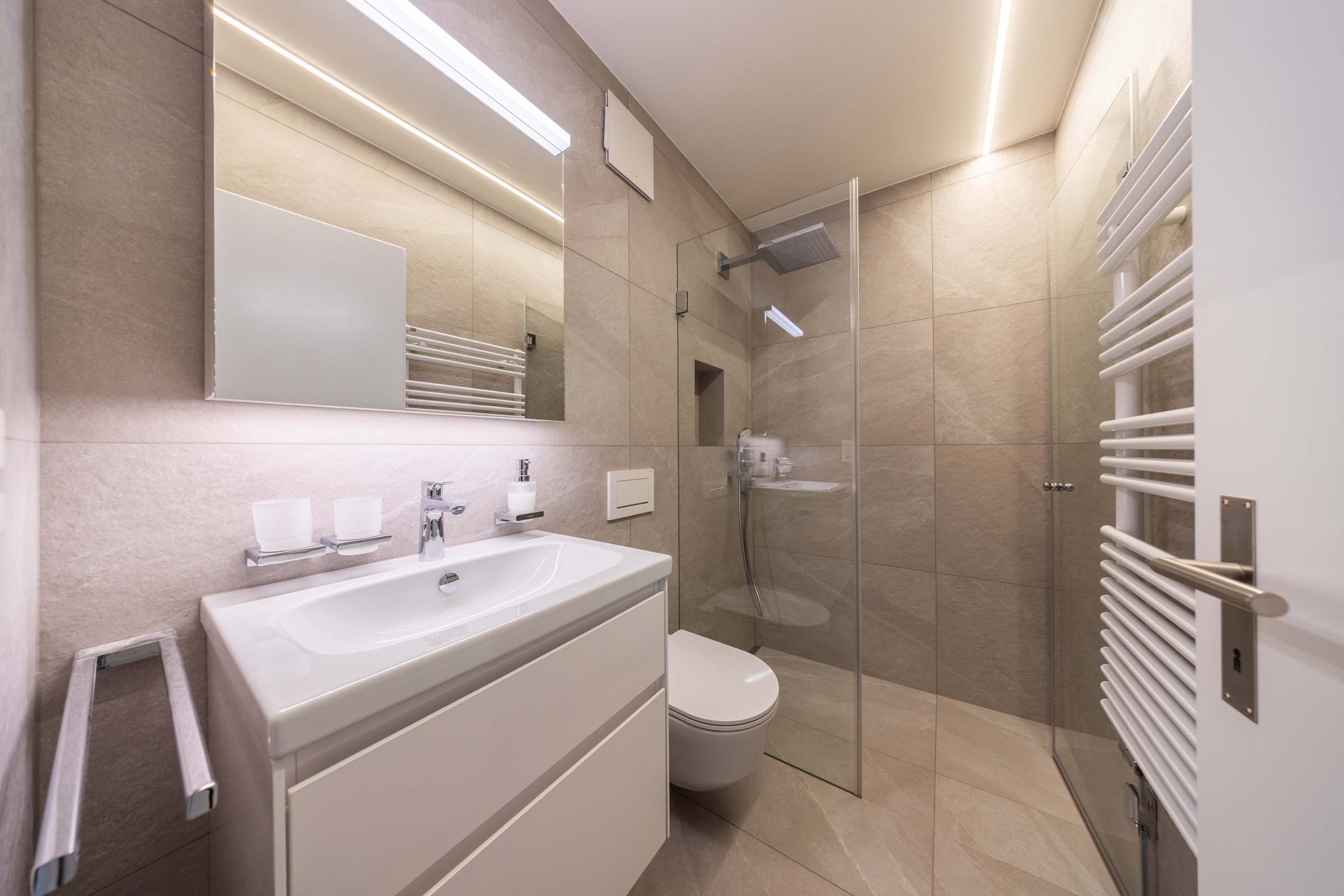 Das moderne Badezimmer ist mit einer grosszügigen Walk-in-Dusche und hochwertigen Armaturen ausgestattet.