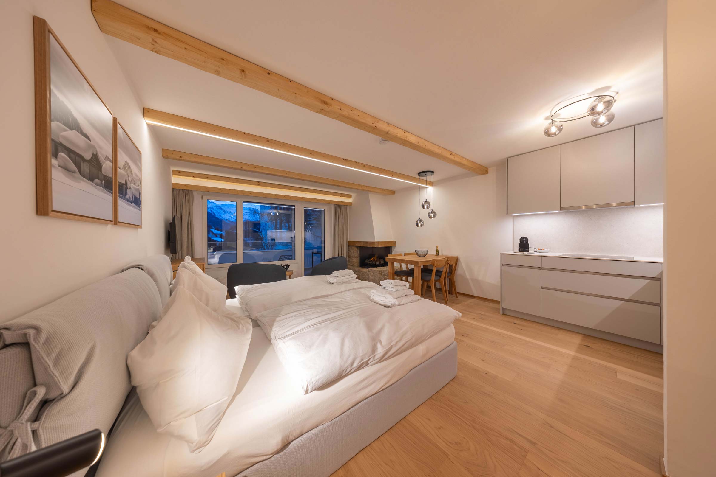 Dieses Exclusive Studio für zwei Personen befindet sich im 2. Stock der Chesa Rosatsch, die bis 2025 vollständig renoviert wurde. Das Studio selbst wurde Ende 2025 mit viel Liebe zum Detail und hochwertigen Materialien fertiggestellt.