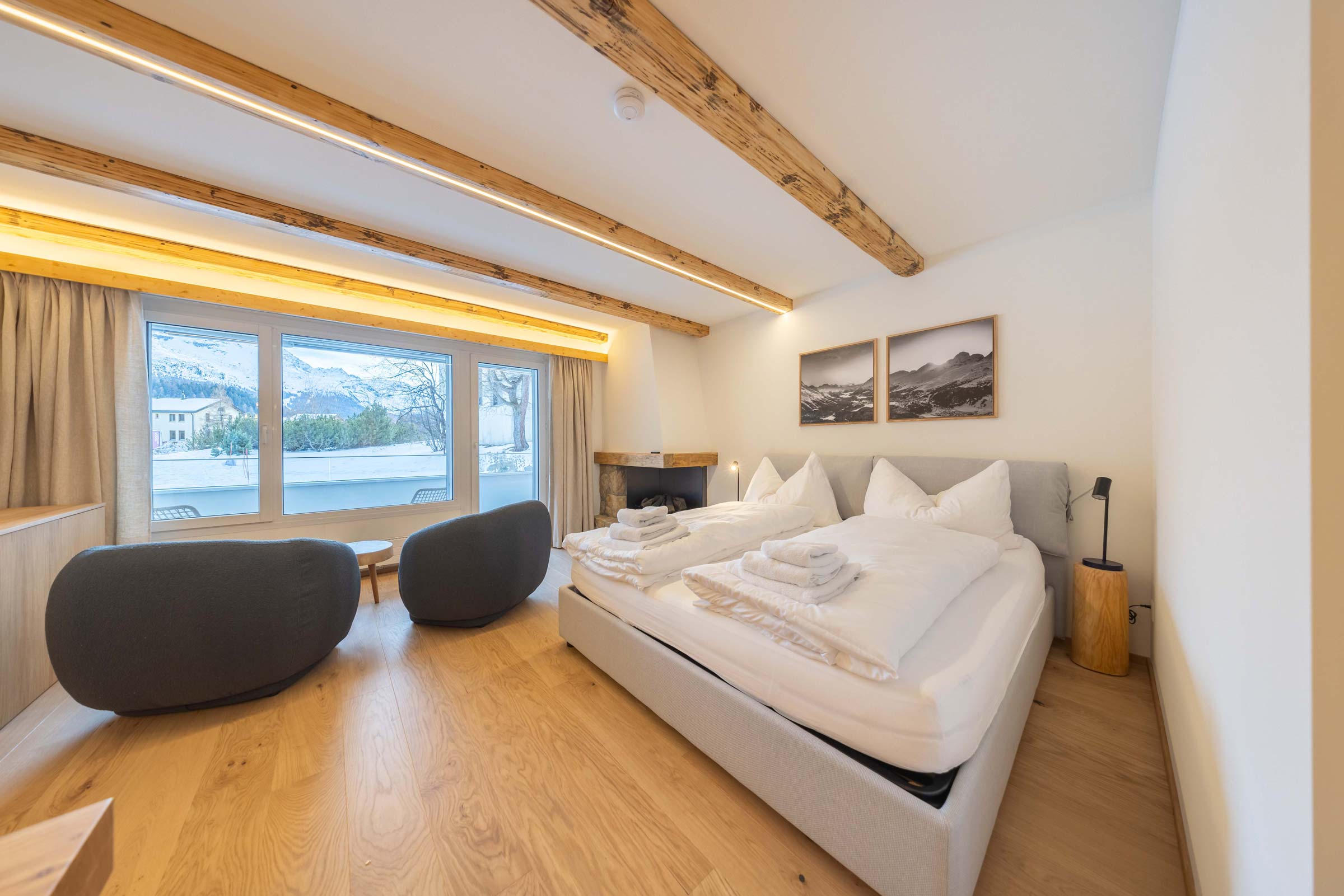 Dieses exklusive Premium Studio für zwei Personen befindet sich im 1. Stock der Chesa Rosatsch, die bis 2025 vollständig renoviert wurde. Das Studio selbst wurde Ende 2025 mit viel Liebe zum Detail und hochwertigen Materialien fertiggestellt.