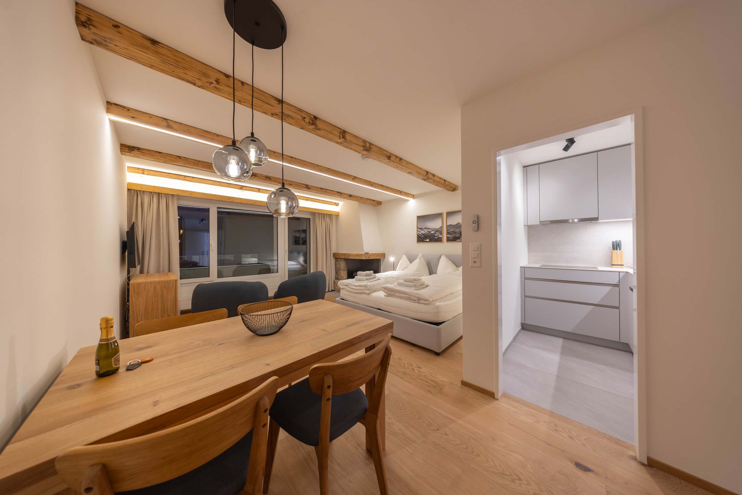 Das Interieur kombiniert einen hochwertigen Eichenholzboden mit italienischen Designmöbeln und schafft eine ausgewogene Atmosphäre aus moderner Eleganz und alpiner Behaglichkeit. Alle Leuchten sind dimmbar und ermöglichen es, die Lichtstimmung jederzeit an die gewünschte Atmosphäre anzupassen. Ein elektrischer Kamin sorgt zusätzlich für eine gemütliche, alpine Stimmung – ideal für entspannte Abende.