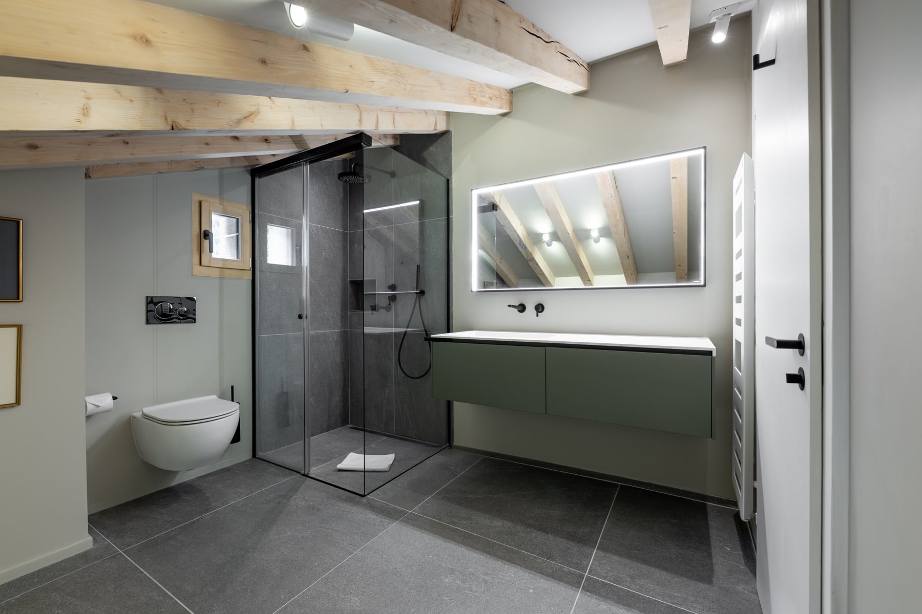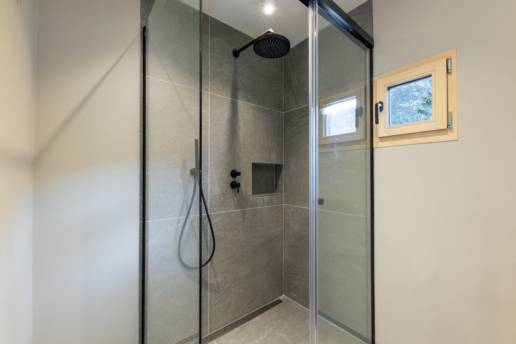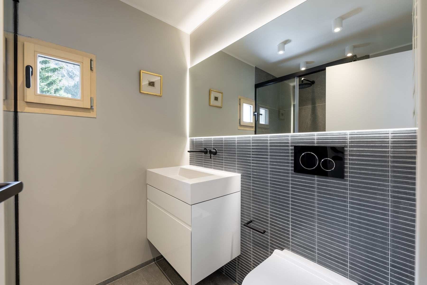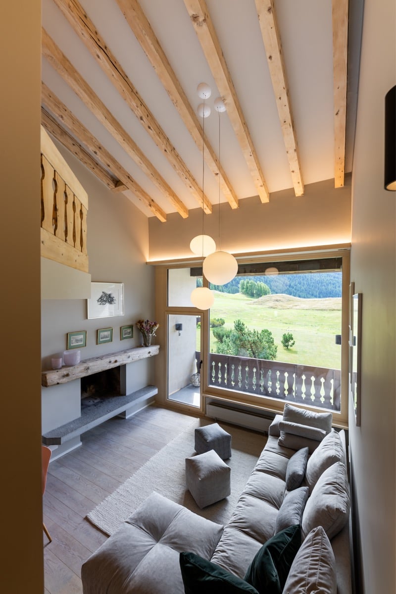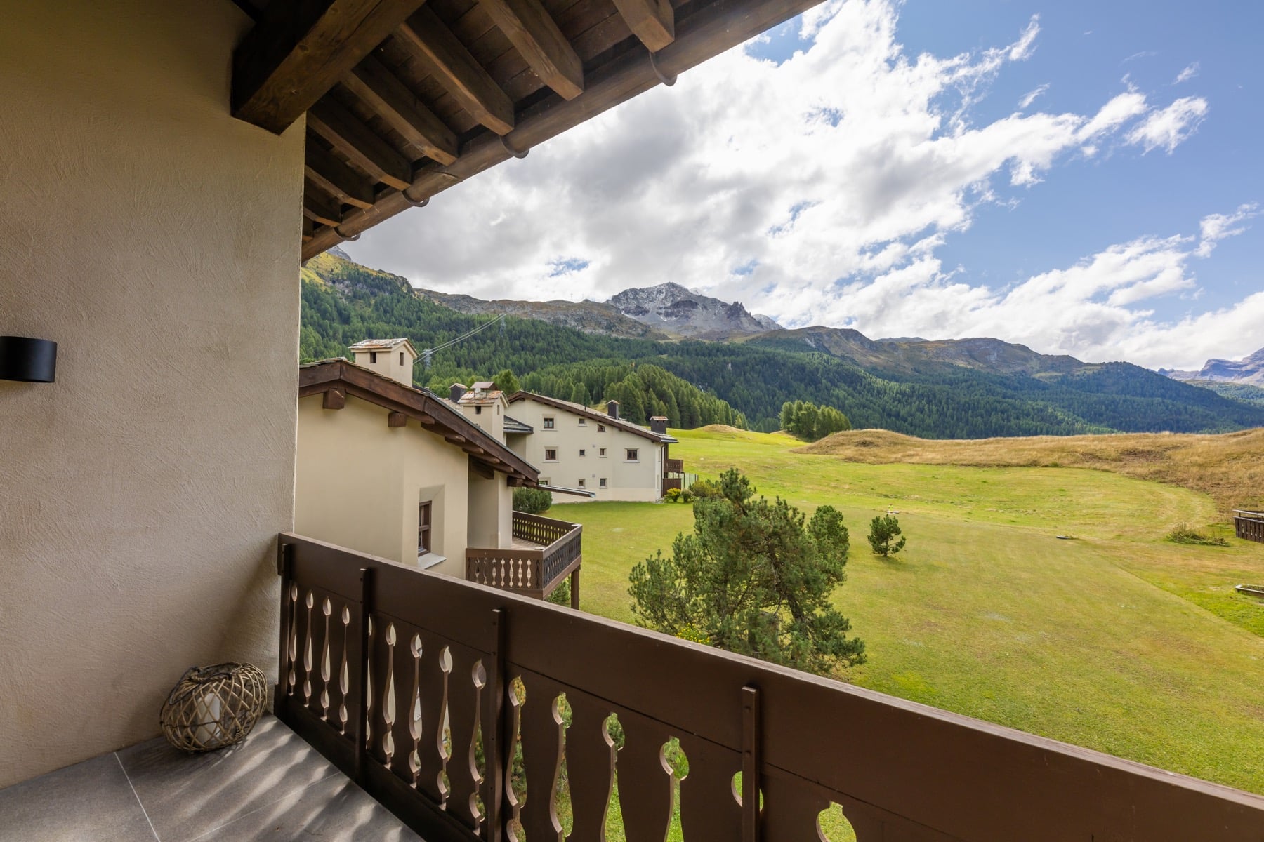 The upper floor of the flat is occupied by a luxury bedroom and a bathroom with shower,whereas the lower floor hosts the living room, as well as the two smaller bedrooms with adjacent bathrooms. The living room is covered with a wooden ceiling and prides itself onan extravagantly large window and a sizeable balcony offering a breathtaking view of the Engadine Valley of the Swiss Alps unimpeded by any building or structure. The kitchen area, with its luxury appliances and fixtures, will meet even the most fastidious demands.