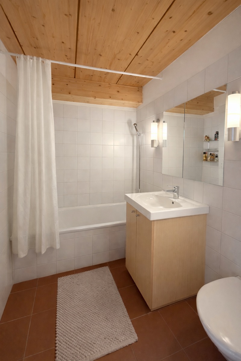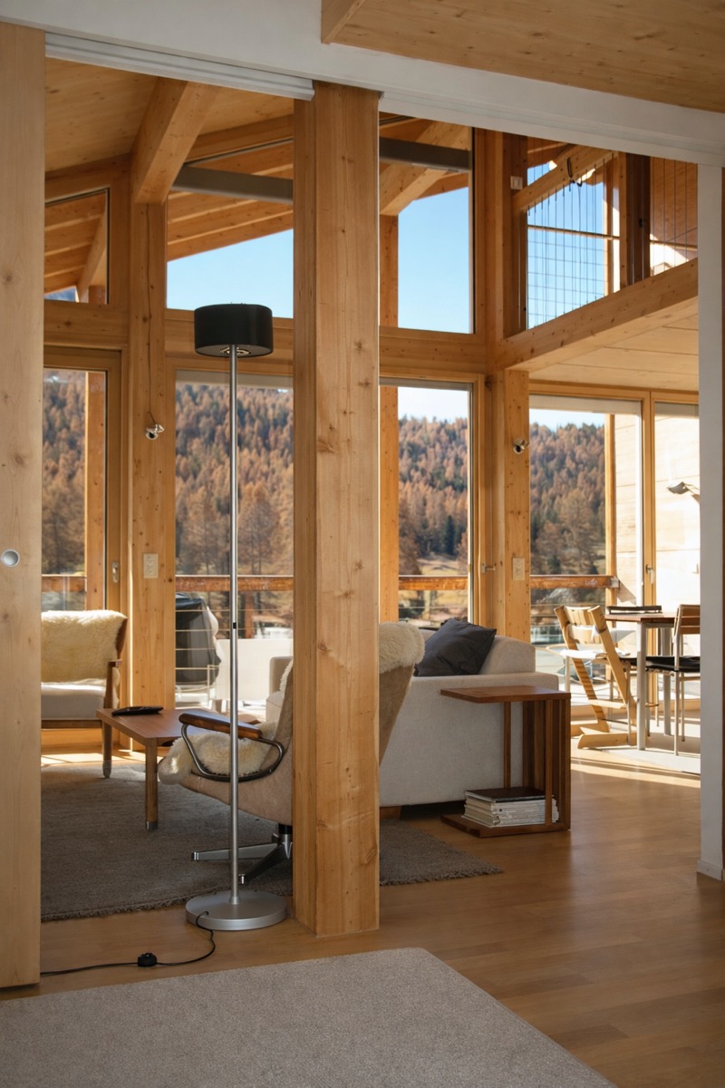 With more than of 100 m2 of living space, the apartment offers a comfortable layout for up to six guests. The open-plan living area connects the fully equipped kitchen with the dining and lounge space, creating a bright, airy atmosphere. Floor-to-ceiling windows over two levels fill the apartment with natural light and frame views of the surrounding Alps, forest and mountain river.From the south-facing balcony, guests can enjoy the sun and the untouched landscape of theEngadin valley.