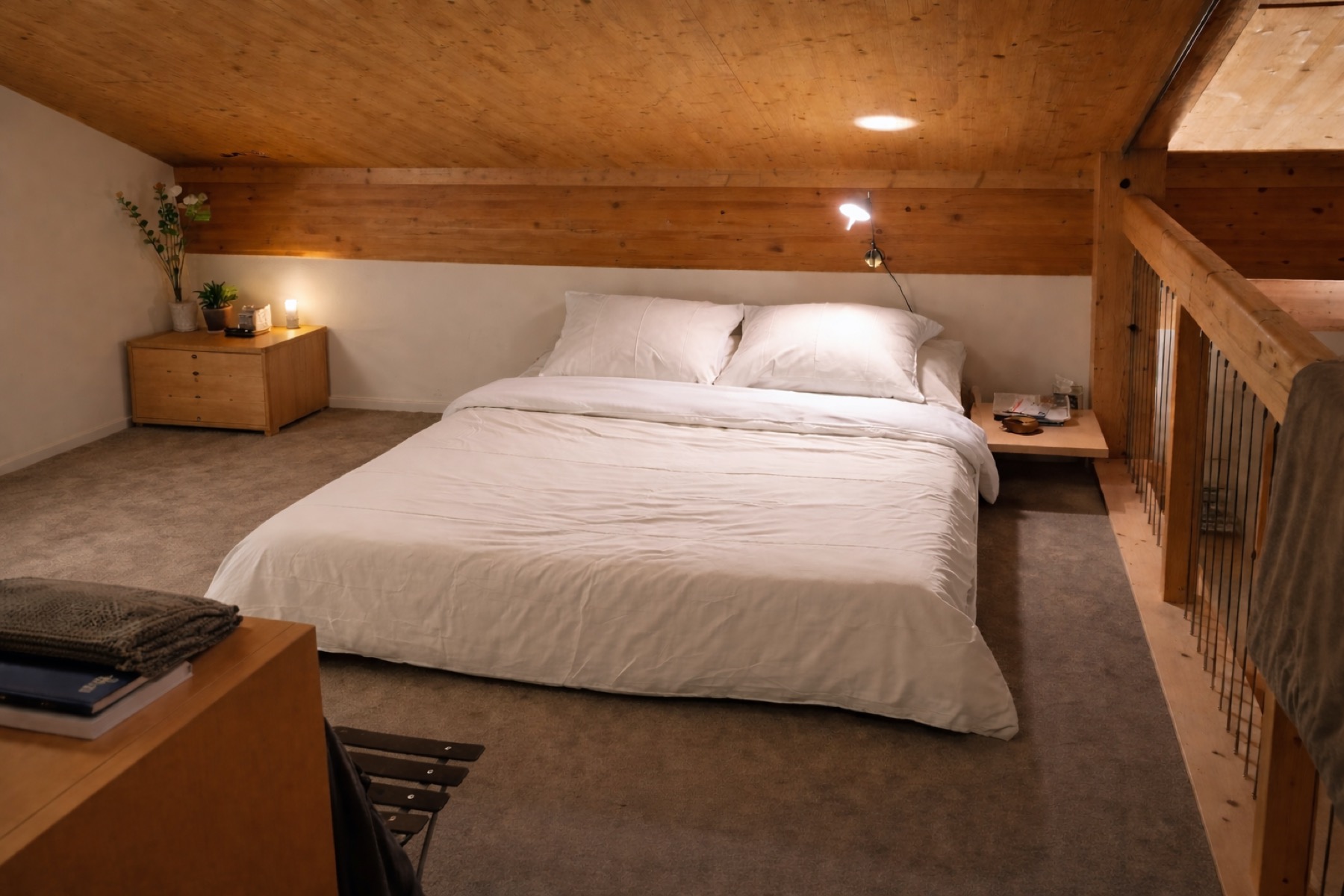 The maisonette layout offers a natural sense of privacy, with two bedrooms on the lower level and the main bedroom on the upper floor. The apartment features two bathrooms (bathtub/WC and shower/WC), a private sauna, and a private laundry room with washing machine and dryer. Two covered parking spaces (carports) are available for added convenience.