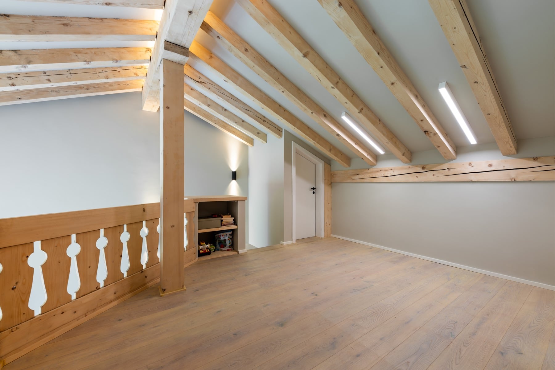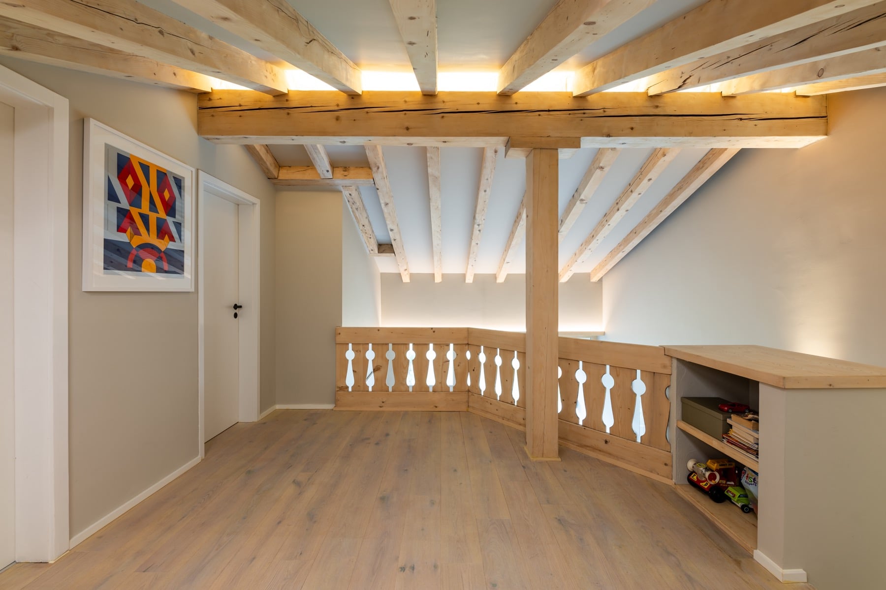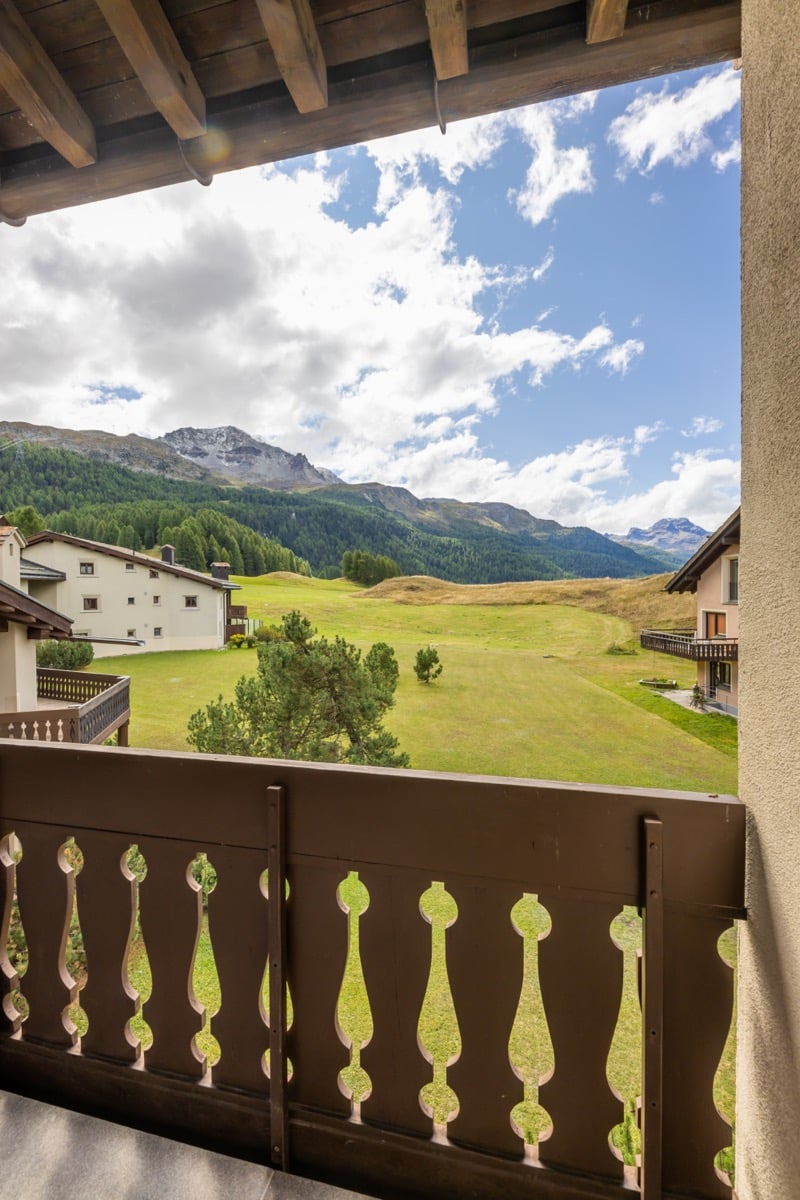 The upper floor of the flat is occupied by a luxury bedroom and a bathroom with shower,whereas the lower floor hosts the living room, as well as the two smaller bedrooms with adjacent bathrooms. The living room is covered with a wooden ceiling and prides itself onan extravagantly large window and a sizeable balcony offering a breathtaking view of the Engadine Valley of the Swiss Alps unimpeded by any building or structure. The kitchen area, with its luxury appliances and fixtures, will meet even the most fastidious demands.